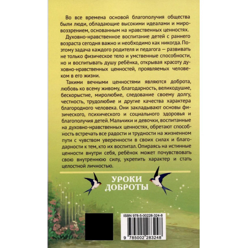 Сборник духовно-нравственных занятий «Уроки Доброты» для детей 6–7 лет будет полезен как родителям, так и педагогам в их взаимодействии с детьми. В сборнике представлены 27 тем, которые: 1) раскрывают духовно-нравственные качества характера и вдохновляют