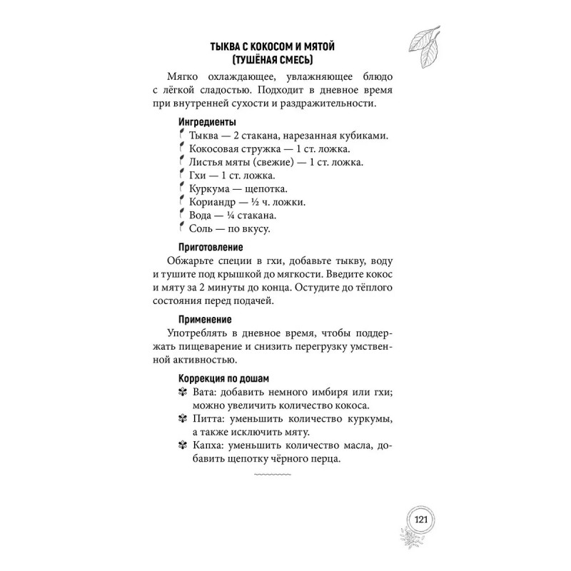 «100 рецептов» — практическое руководство по системе питания, основанной на принципах аюрведы. В книге собраны рецепты повседневных блюд, напитков, пряных смесей и вспомогательных средств, применяемых в традиционной индийской кулинарии. Каждый рецепт снаб