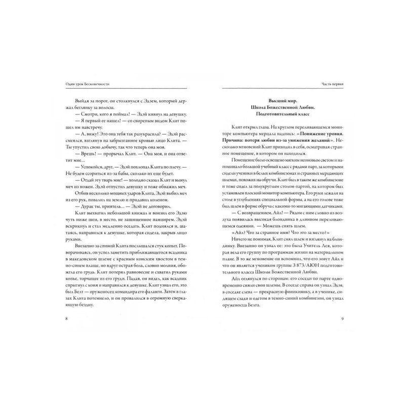 События книги переносят нас в школу Божественной Любви, где главные герои - Айл, Нэд и Юна - ученики подготовительного класса, урок за уроком проходят свой путь совершенствования. Но место их обучения - планета Земля, а задание - блестяще выполнить свое воплощение в различных телесных оболочках - от праведников и святых до убийц и воров.Погружая героев в новые и новые тела, автор показывает, насколько мы зависимы от земного мира, своих прихотей и страстей, и как мы можем справиться с ними. Рассказывая истории разных человеческих судеб, автор поразительным образом переплетает земной и небесный миры, скрытое и зримое, быль и вымысел. В одной книге вы найдете описания разных эпох и стран, исторических реалий и личностей, роман пронизан античными и библейскими образами, персонажами классической мировой и русской литературы. Динамичный сюжет, небольшие по объему главы и быстрое переключение из "земного" плана в "небесный" создают атмосферу интриги и делают текст, в котором зашифрованы новейшие сведения об устройст
