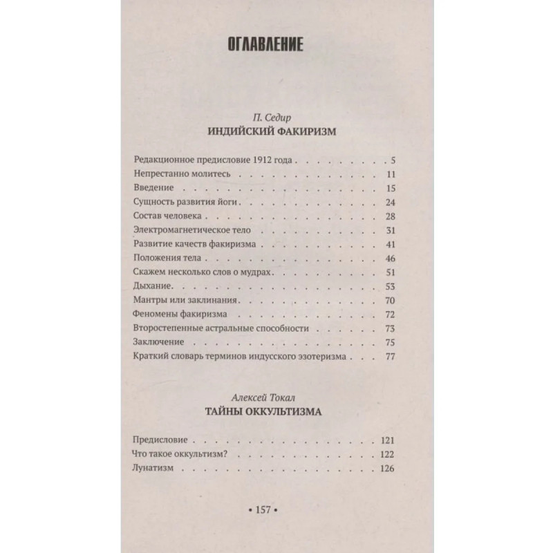 Данный сборник состоит из двух работ: 1) "Индийский факиризм или практическая школа упражнений для развития психических способностей" французского оккультиста, писателя и популяризатора эзотерических знаний Поля Седира (1871-1926); 2) "Тайны оккультизма в общедоступном изложении" русского мистика и публициста конца XIX-XX века Алексея Токала. В первой части П. Седир знакомит читателя с основами медитации и йоги, а также даёт базовые знания по энергетическому и чакральному строению человека, попутно приводя рекомендации по развитию экстраординарных психических способностей. В конце первой части приведён превосходный словарь терминов индусского эзотеризма, в котором большое количество довольно сложных терминов раскрыто путём простого и понятного описания. Во второй части А. Токал приводит начальную информацию по эзотеризму, попутно раскрывая такие темы, как лунатизм, сомнамбулизм, гипнотизм, ясновидение, телепатия, предостерегательные сны и спиритизм.
