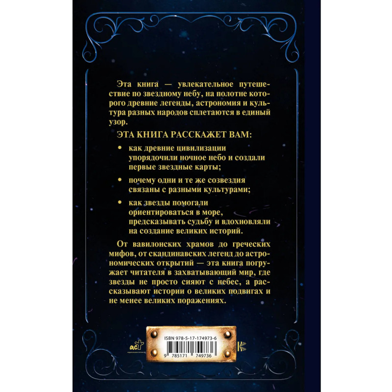 Эта книга — увлекательное путешествие по звездному небу, на полотне которого древние легенды, астрономия и культура разных народов сплетаются в единый узор. От вавилонских храмов до греческих мифов, от скандинавских легенд до астрономических открытий — эта книга погружает читателя в захватывающий мир, где звезды не просто сияют с небес, а рассказывают истории о великих подвигах и не менее великих поражениях. В ней вы найдете различные созвездия Северного и Южного полушарий, информацию о том, как отыскать их на небе, а также легенды и мифы, связанные с ними. Метафоричные иллюстрации и эпиграфы из мировой литературы помогут глубже погрузиться в загадочный мир ночного неба. Кристабель Илай, — писательница и поэтесса, художник слова. Она живет у океана и обучает видеть красоту в каждом мгновении.