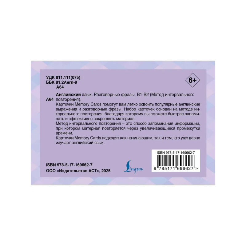 Карточки Memory Cards помогут вам легко освоить популярные английские выражения и разговорные фразы. Набор карточек основан на методе интервального повторения, благодаря которому вы сможете быстрее запоминать и эффективно закреплять материал. Метод интервального повторения – это способ запоминания информации, при котором материал повторяется через увеличивающиеся промежутки времени. Карточки Memory Cards подходят как начинающим, так и тем, кто уже давно изучает английский язык.