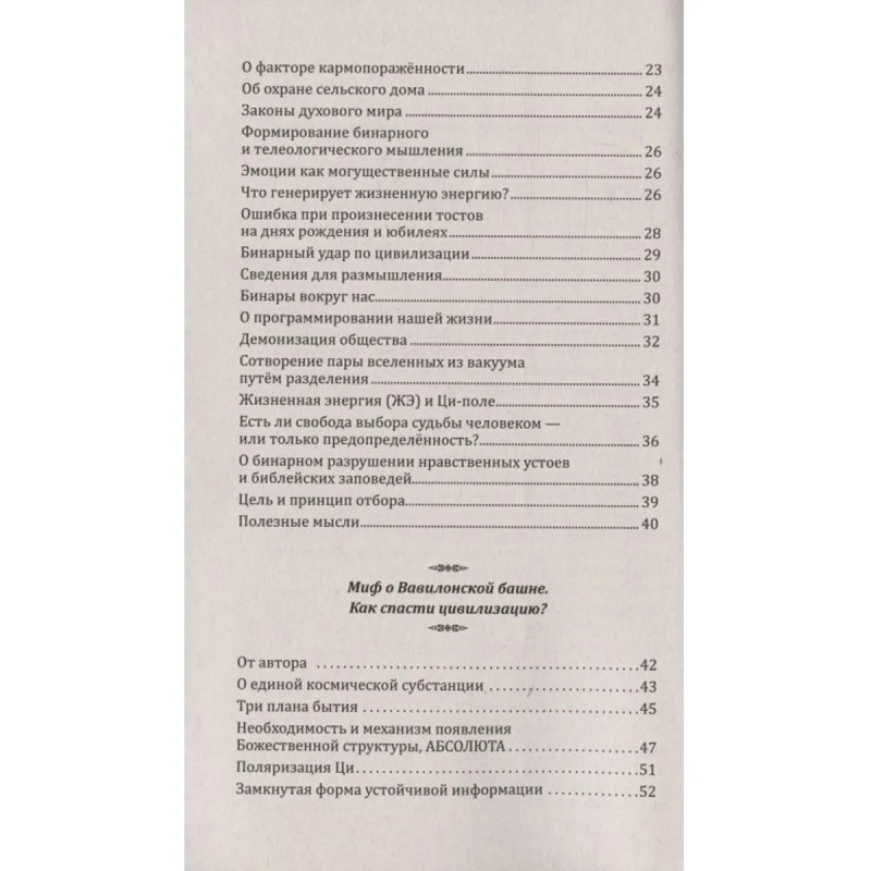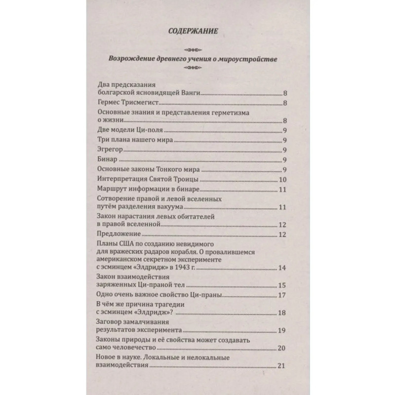 В данном издании раскрываются проблемы современной цивилизации и предлагаются пути их решения с позиций эниологии - науки об энергоинформационном обмене. Автор предпринимает попытку убедить людей в необходимости радикальной коррекции мировоззрения, дабы привести его в соответствие с нравственными и эниологическими законами. Сборник состоит из двух работ Н. Б. Старинской:1) "Возрождение древнего учения о мироустройстве. Почему провалился секретный американский эксперимент с эсминцем "Элдридж" в 1943 году?";2) "Миф о Вавилонской башне. Как спасти цивилизацию? Цивилизация теряет управление в судьбоносных проблемах".Для широкого круга читателей, интересующихся эниологией и эзотерикой.