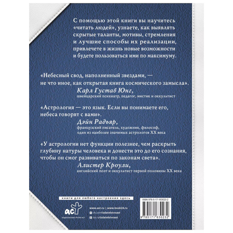 Книга Мартина Вэлса в доступной форме познакомит вас с астрологией, научит составлять и трактовать космограммы, для чего, в отличие от персонального гороскопа, достаточно знать дату рождения, а время вовсе не обязательно. По космограмме вы сможете определить глубинные, истинные качества человека, узнаете его скрытые таланты, поймете, в чем зерно его характера, и сможете скорректировать линию поведения таким образом, чтобы максимально задействовать эти ресурсы и получать выдающиеся результаты. Мартин Вэлс, астролог с двадцатилетним стажем, подробно расскажет о влиянии звезд и планет на каждый знак зодиака. Изящное издание станет прекрасным подарком не только для новичка, но и для опытного астролога.
