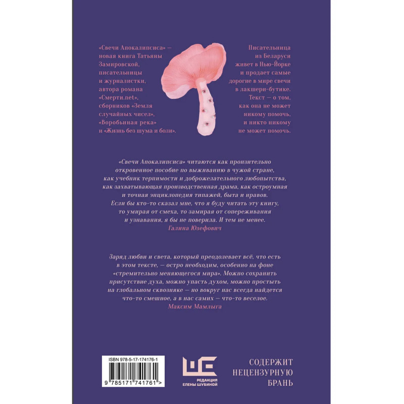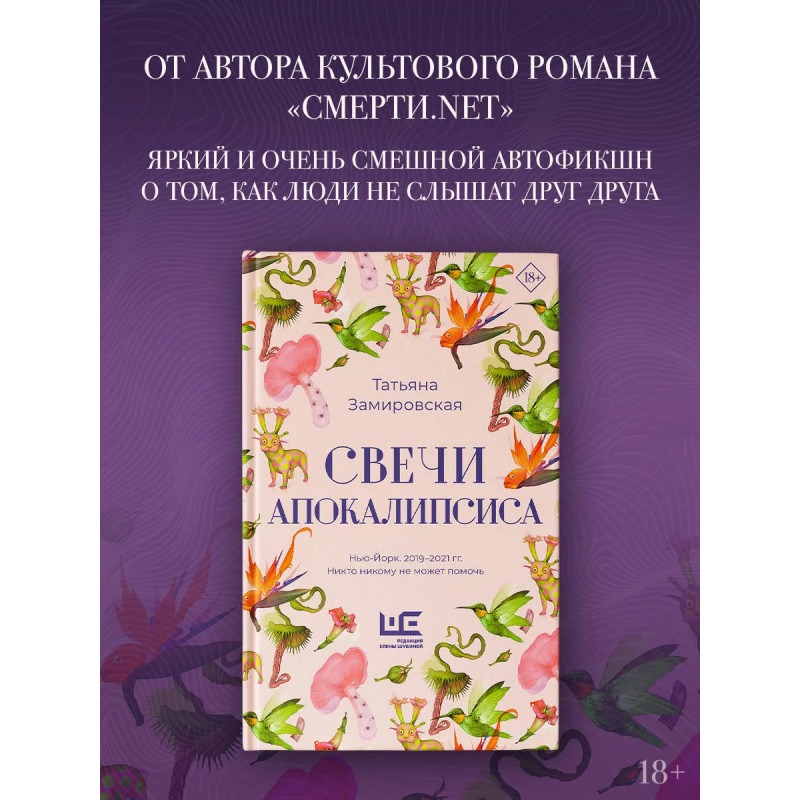 – Новая история писательницы Татьяны Замировской, автора нашумевшего романа «Смерти net», сборников «Земля случайных чисел», «Воробьиная река» и «Жизнь без шума и боли». – Захватывающий и невероятно смешной автофикшн о том, как люди не слышат друг друга. – Молодая писательница работает в магазинчике бессмысленно дорогих дизайнерских свечей в Нью-Йорке и никак не может помочь клиентам. – Нью-Йорк 2019–2021 годов: капитализм и выживание на другом конце земного шара. – Серия яркой российской прозы «Классное чтение».