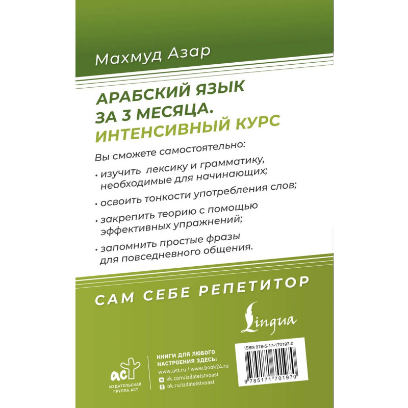 Махмуд Азар — автор множества справочных и учебных пособий по арабскому языку. Его книги позволяют овладеть языком с нуля и постепенно перейти к чтению Священного Корана в оригинале. Данный самоучитель поможет в короткий срок овладеть лексическим и грамматическим минимумом начального уровня и простыми формами разговорной речи. Курс состоит из 21 урока. В каждом уроке представлены основные грамматические темы и полезная лексика, необходимая в повседневном общении. Для отработки практических навыков предлагаются упражнения с ответами. В конце книги вы найдете краткий русско-арабский словарь. Книга адресована всем, кто хочет в краткие сроки овладеть основами арабского языка.