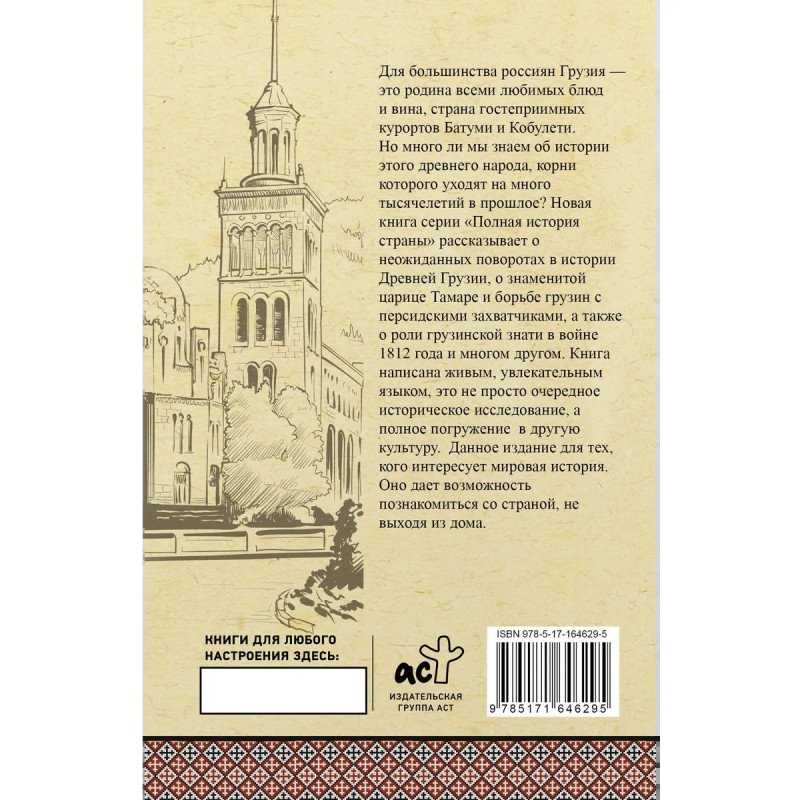 Для большинства россиян Грузия — это родина всеми любимых блюд и вина, страна гостеприимных курортов Батуми и Кобулети. Но много ли мы знаем об истории этого древнего народа, корни которого уходят на много тысячелетий в прошлое? Новая книга серии "Полная история страны" рассказывает о неожиданных поворотах в истории Древней Грузии, о знаменитой царице Тамаре и борьбе грузин с персидскими захватчиками, а также о роли грузинской знати в войне 1812 года и многом другом. Книга написана живым, увлекательным языком, это не просто очередное историческое исследование, а полное погружение в другую культуру. Данное издание для тех, кого интересует мировая история. Оно дает возможность познакомиться со страной, не выходя из дома.