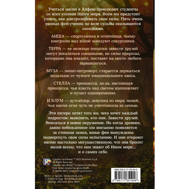 Новеллизация сериала Netflix Судьба: Сага Винкс. История о дружбе, отваге и поиске себя. Пять фей объединяются, чтобы спасти Иной мир от опасности, которая разрастается даже в стенах школы. Блум отправляется учиться магии в Алфею академию для фей со всего Иного мира. Её окружают талантливые волшебницы, потомственные маги, и лишь она одна выглядит как чужая. Но загадочные обстоятельства вынуждают всех учеников быстро поделиться на друзей и врагов. Блум предстоит обзавестись подругами, влюбиться, побороть чувство вины и раскрыть в себе энергию такой силы, которую никто еще не видел.