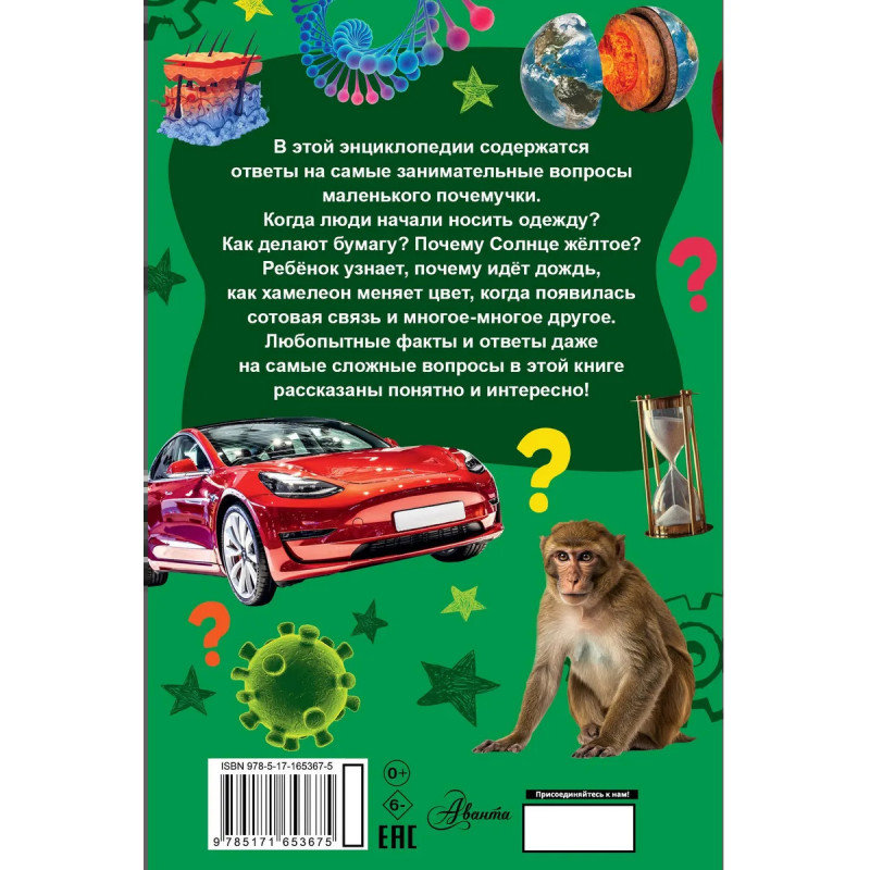 В этой энциклопедии содержатся ответы на самые занимательные вопросы маленького почемучки. Когда люди начали носить одежду? Как делают бумагу? Почему Солнце жёлтое? Ребёнок узнает, почему идёт дождь, как хамелеон меняет цвет, когда появилась сотовая связь и многое-многое другое. Любопытные факты и ответы даже на самые сложные вопросы в этой книге рассказаны понятно и интересно! Для среднего школьного возраста.