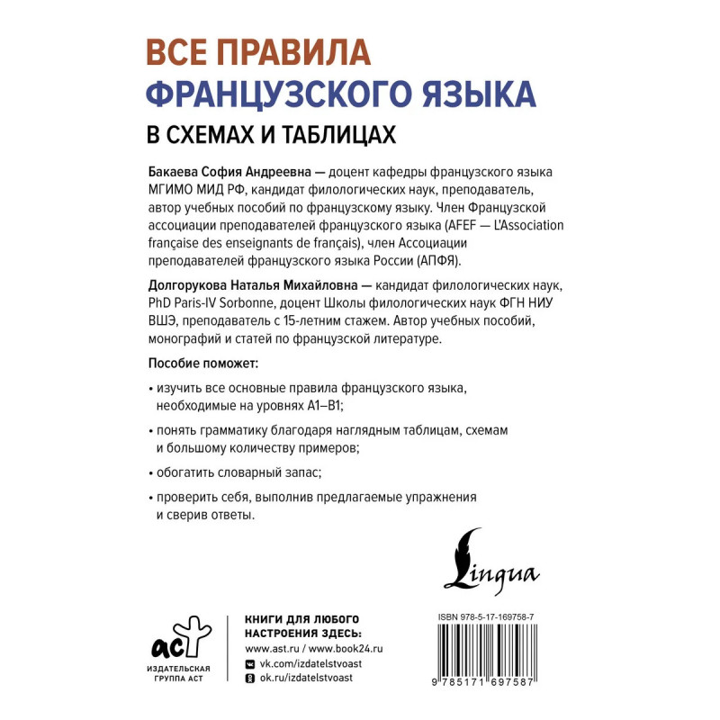 Бакаева София Андреевна — доцент кафедры французского языка МГИМО МИД РФ, кандидат филологических наук, преподаватель, автор учебных пособий по французскому языку. Член Французской ассоциации преподавателей французского языка (AFEF — L'Association française des enseignants de français), член Ассоциации преподавателей французского языка России (АПФЯ). Долгорукова Наталья Михайловна — кандидат филологических наук, PhD Paris-IV Sorbonne, доцент Школы филологических наук ФГН НИУ ВШЭ, преподаватель с 15-летним стажем. Автор учебных пособий, монографий и статей по французской литературе. Авторы написали пособие, с помощью которого вы изучите все основные правила французского языка, необходимые на уровнях A1–B1; поймете грамматику благодаря наглядным таблицам, схемам и большому количеству примеров; обогатите словарный запас; сможете проверить себя, выполнив предлагаемые упражнения и сверив ответы.