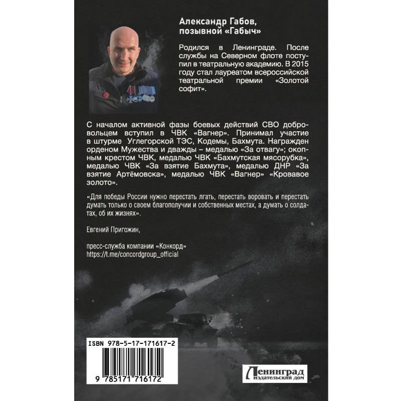 История русского мужика, который пошел добровольцем на фронт и в составе ЧВК "Вагнер" участвовал в штурмах Углегор- ской ТЭС, Кодема, Бахмута. Боец с позывным "Габыч" воспроизводит реальную картину тех событий, которые штурмовик испытывает, находясь в самом пекле мясорубки. В книге описан боевой путь второго взвода шестого штур- мового отряда под командованием "Дикого", одного из самых легендарных командиров ЧВК "Вагнер".