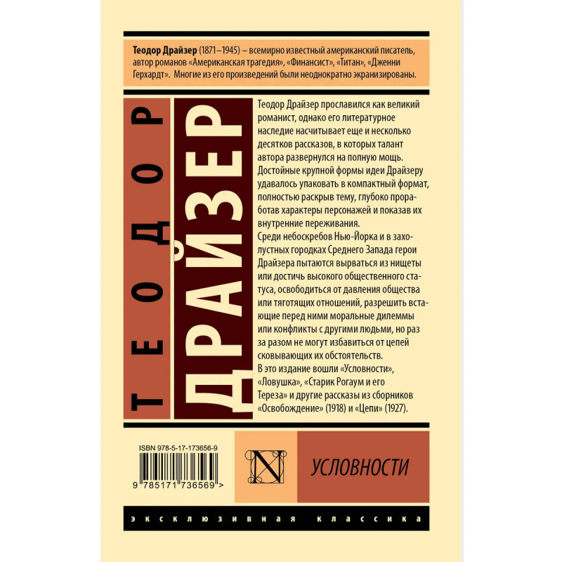 — Теодор Драйзер — выдающийся американский писатель, журналист и общественный деятель, один из виднейших представителей натурализма и критического реализма в американской литературе. — Теодор Драйзер — автор романов «Финансист», «Титан» и «Американская трагедия». — Сборник малой прозы Драйзера. В это издание вошли избранные рассказы из сборников «Освобождение» (1918) и «Цепи» (1927). — Издание в серии «Эксклюзивная классика» — в удобном карманном формате и узнаваемом оформлении.