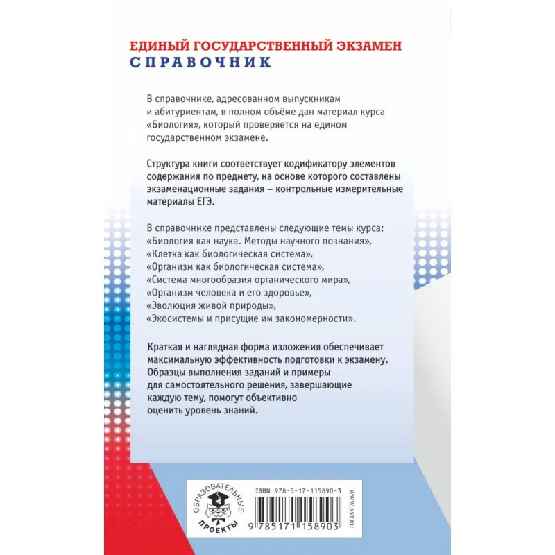 Вниманию учащихся и учителей предлагается новое учебное пособие, которое поможет успешно подготовиться к единому государственному экзамену по биологии. Справочник содержит весь теоретический материал по курсу биологии, необходимый для сдачи ЕГЭ. Он включает в себя все элементы содержания, проверяемые контрольно-измерительными материалами, и помогает обобщить и систематизировать знания и умения за курс средней (полной) школы. Теоретический материал изложен в краткой, доступной форме. Каждый раздел сопровождается примерами тестовых заданий, позволяющими проверить свои знания и степень подготовленности к аттестационному экзамену. Практические задания соответствуют формату ЕГЭ. В конце пособия приводятся ответы к тестам, которые помогут школьникам и абитуриентам проверить себя и восполнить имеющиеся пробелы. Пособие адресовано школьникам, абитуриентам и учителям.