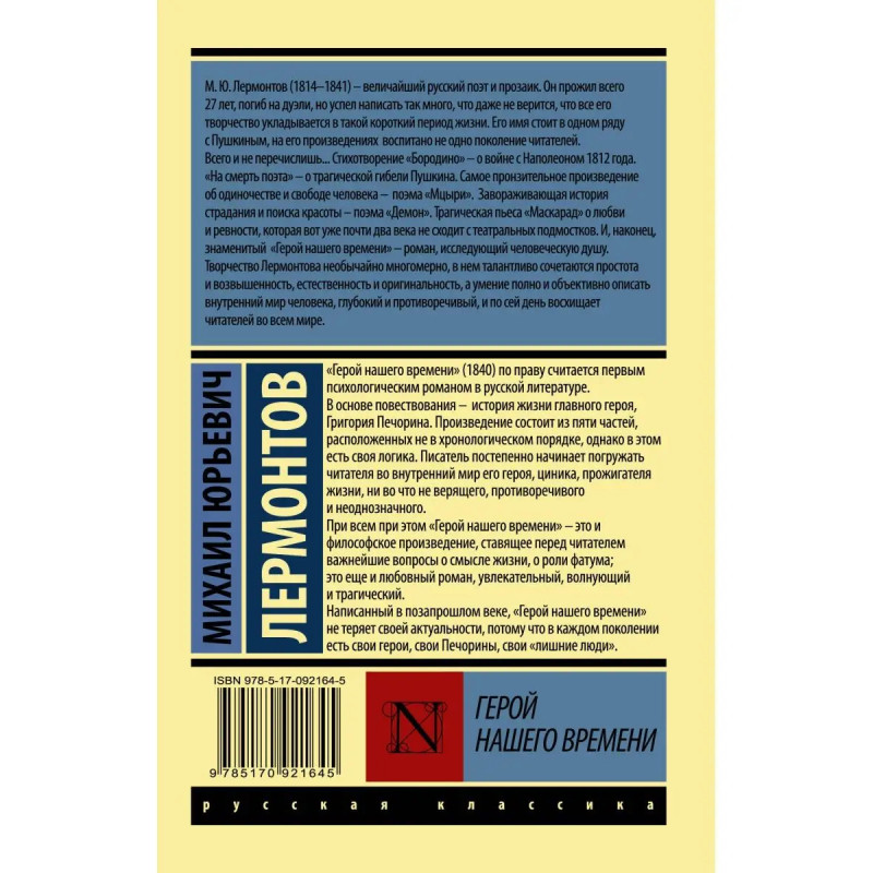 "Герой нашего времени" (184) по праву считается первым психологическим романом в русской литературе. В основе повествования история жизни главного героя, Григория Печорина. Произведение состоит из пяти частей, расположенных не в хронологическом порядке, однако в этом есть своя логика. Писатель постепенно начинает погружать читателя во внутренний мир его героя, циника, прожигателя жизни, ни во что не верящего, противоречивого и неоднозначного. При всем при этом "Герой нашего времени" это и философское произведение, ставящее перед читателем важнейшие вопросы о смысле жизни, о роли фатума; это еще и любовный роман, увлекательный, волнующий и трагический. Написанный в позапрошлом веке "Герой нашего времени", не теряет своей актуальности, потому что в каждом поколении есть свои герои, свои Печорины, свои "лишние люди".