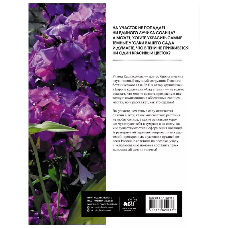 Цветник в тени. Неприхотливые растения для вашего сада. На участок не попадает ни единого лучика солнца? А может, хотите украсить самые темные уголки вашего сада и думаете, что в тени не приживется ни один красивый цветок? Римма Карписонова - доктор биологических наук, главный научный сотрудник Главного ботанического сада РАН и автор крупнейшей в Европе коллекции "Сад в тени" - не только докажет, что можно создать прекрасную цветочную композицию в обделенных солнцем местах, но и расскажет, как это сделать! Вы узнаете, чем тень в саду отличается от тени в лесу; какие многолетние растения не любят солнце, а какие одинаково хорошо чувствуют себя в сумраке и на свету; какие существуют стили оформления цветника. А развернутый перечень неприхотливых растений, проверенных в условиях средней полосы России, с советами по посадке, уходу и использованию поможет составить теневыносливый цветник мечты!
