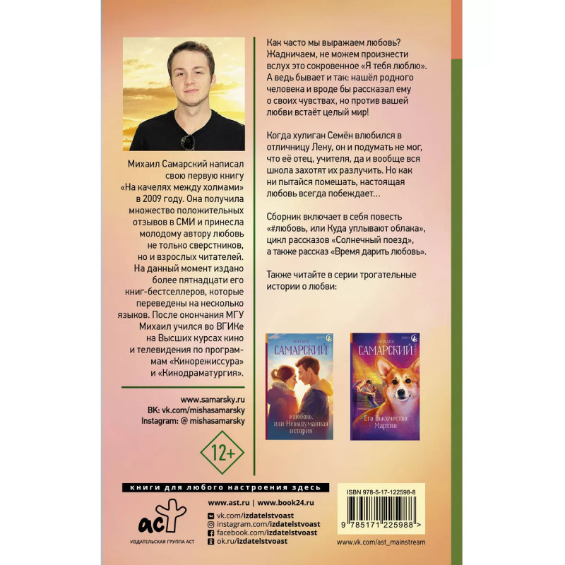Время дарить любовь. Как часто мы выражаем свою любовь? Жадничаем, не можем произнести вслух это сокровенное "Я тебя люблю". А ведь бывает и так: нашёл родного человека и вроде бы рассказал ему о своих чувствах, но против вашей любви встаёт целый мир! Когда хулиган Семён влюбился в отличницу Лену, он и подумать не мог, что её отец, учителя, да и вообще вся школа захотят их разлучить. Но как ни пытайся помешать, настоящая любовь всегда побеждает Сборник включает в себя повесть "#любовь, или Куда уплывают облака", цикл рассказов "Солнечный поезд", а также рассказ "Время дарить любовь".