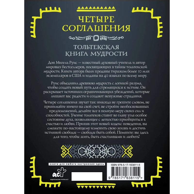 Дон Мигель Руис — известный духовный учитель и автор мировых бестселлеров, посвящающих в тайны тольтекской мудрости. Книги автора были проданы тиражом более 10 млн экземпляров в США и изданы на 40 языках по всему миру. Руис объединил древнюю мудрость с логикой разума, чтобы создать новый путь для стремящихся к истине. Он раскрывает источники ограничивающих убеждений, которые лишают вас радости и создают ненужные страдания. Четыре соглашения звучат так: никогда не грешите словом, не принимайте ничего на свой счет, не стройте необоснованных предположений, делайте все в полную меру своих сил и способностей. Учение тольтеков ставит во главу угла особое состояние духа, позволяющее с легкостью приобщиться к счастью и любви. Приняв этот новый кодекс поведения, вы сможете по-настоящему изменить свою жизнь и достичь истинной свободы — свободы быть собой. Помните: вы здесь для того, чтобы жить, быть счастливыми и любить!