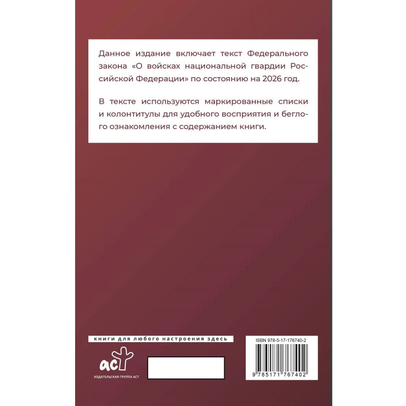 Данное издание включает текст Федерального закона «О войсках национальной гвардии Российской Федерации» на 2026 год. В тексте используются маркированные списки и колонтитулы для удобного восприятия и беглого ознакомления с содержанием книги. Издание учитывает все изменения, опубликованные в официальных источниках на момент подписания издания в печать.