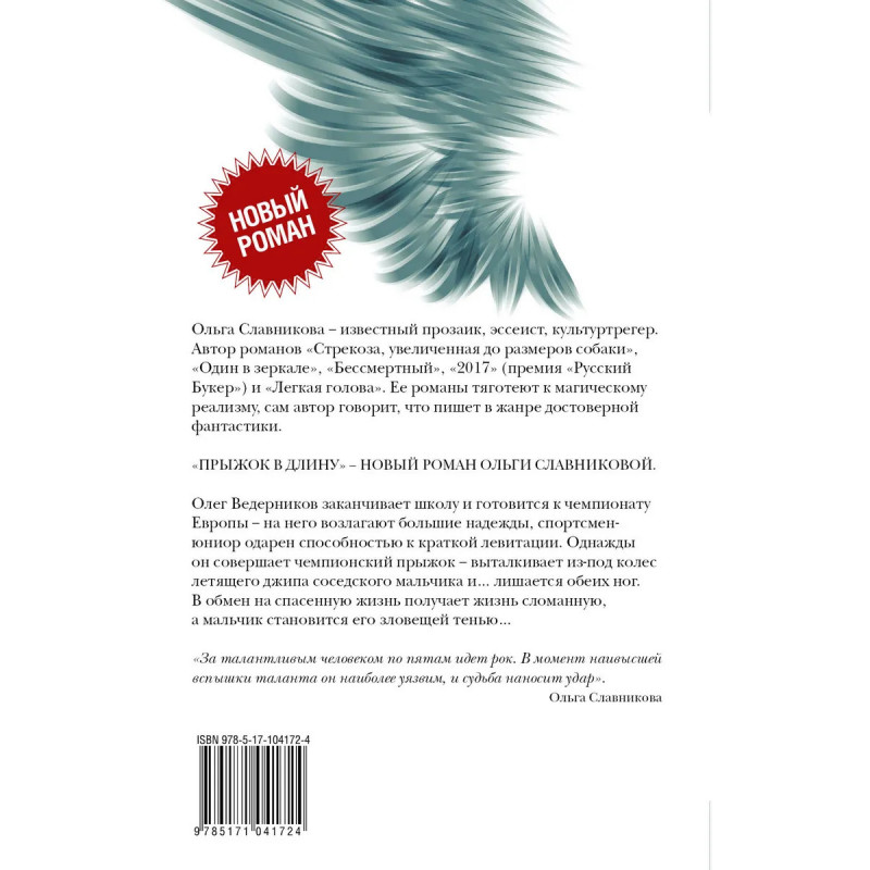 Ольга Славникова — известный прозаик, эссеист, культуртрегер. Автор романов "Стрекоза, увеличенная до размеров собаки", "Один в зеркале", "Бессмертный", "2017" (премия "Русский Букер") и "Легкая голова". Ее романы тяготеют к магическому реализму, сам автор говорит, что пишет в жанре достоверной фантастики. "Прыжок в длину" — новый роман Ольги Славниковой. Олег Ведерников заканчивает школу и готовится к чемпионату Европы — на него возлагают большие надежды, спортсмен-юниор одарен способностью к краткой левитации. Однажды он совершает чемпионский прыжок — выталкивает из-под колес летящего джипа соседского мальчика и… лишается обеих ног. В обмен на спасенную жизнь получает жизнь сломанную, а мальчик становится его зловещей тенью… "За талантливым человеком по пятам идет рок. В момент наивысшей вспышки таланта он наиболее уязвим, и судьба наносит удар". Ольга Славникова