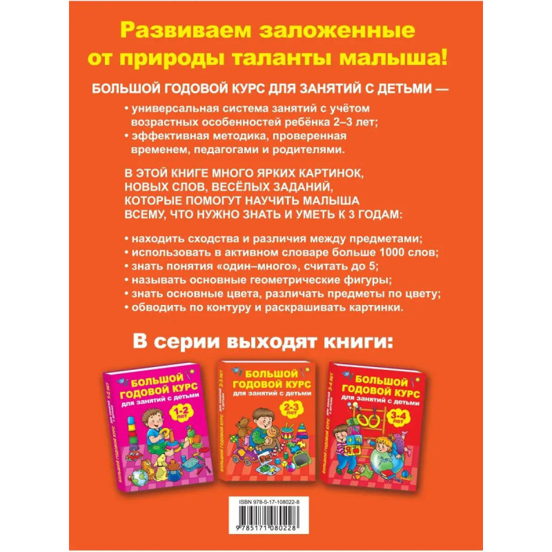Мозг ребенка с первых лет жизни развивается феноменально быстро и впитывает информацию как губка. Речь, творческие способности, аналитическое мышление, логика, координация движений, сенсорное и слуховое восприятие... Ему так много предстоит освоить! Серия пособий Большой годовой курс для занятий с детьми поможет в комплексном пошаговом развитии этих навыков. Для работы с книгами серии не требуется специального педагогического образования, можно заниматься дома в свое удовольствие, выполняя по одному упражнению каждый день. Данная книга предназначена для малышей 2 - 3 лет. Интерактивные задания пополнят словарный запас ребенка, закрепят представление о цвете и форме, научат счету и помогут развить мелкую моторику рук.