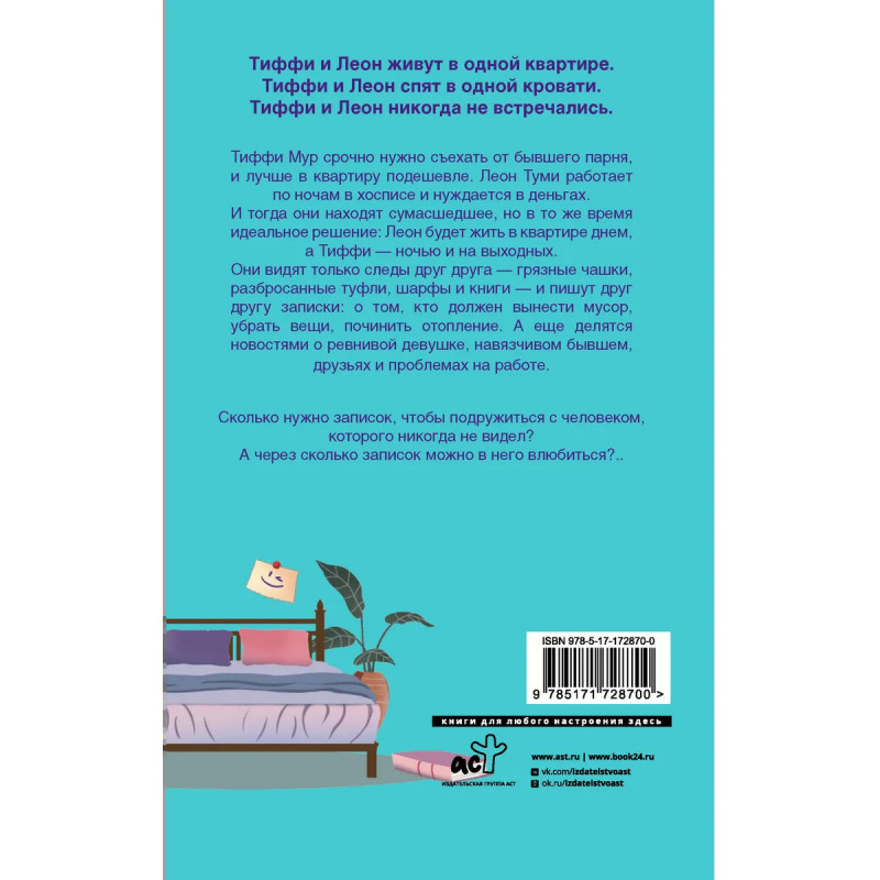Тиффи Мур срочно нужно съехать от бывшего парня, и лучше в квартиру подешевле. Леон Туми работает по ночам в хосписе и нуждается в деньгах. И тогда они находят сумасшедшее, но в то же время идеальное решение: Леон будет жить в квартире днем, а Тиффи — ночью и на выходных. Они видят только следы друг друга — грязные чашки, разбросанные туфли, шарфы и книги — и пишут друг другу записки: о том, кто должен вынести мусор, убрать вещи, починить отопление. А еще делятся новостями о ревнивой девушке, навязчивом бывшем, друзьях и проблемах на работе. Сколько нужно записок, чтобы подружиться с человеком, которого никогда не видел? А через сколько записок можно в него влюбиться?..