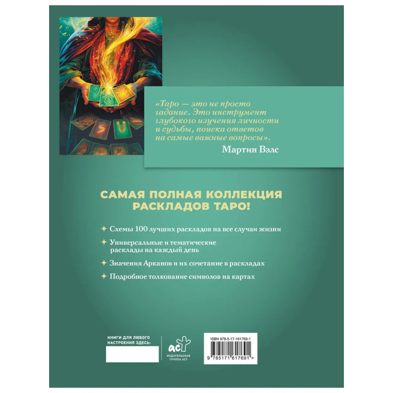 Карты Таро способны осветить будущее, прояснить тайны прошлого, растолковать настоящее. Расклады помогут понять ситуацию, сформировать полную картину происходящего и сделать верные прогнозы на будущее. В этой книге вы найдете 100 лучших раскладов на все случаи жизни с подробным толкованием каждой карты от признанного эксперта в эзотерике Мартина Вэлса. Книга подойдет как тем, у кого уже есть опыт гаданий, так и тем, кто только начинает свой путь в Таро. Подробные схемы раскладов подходят для любой колоды Таро и помогут вам быстро освоить принципы и правила гадания и с их помощью управлять своей жизнью. В книге вы найдете: расклады на все случаи жизни; подробное толкование символов на картах Таро Уэйта; значения всех Арканов; полезные рекомендации по работе с картами Таро. Расклады из этой книги сделают вас повелителем судьбы!
