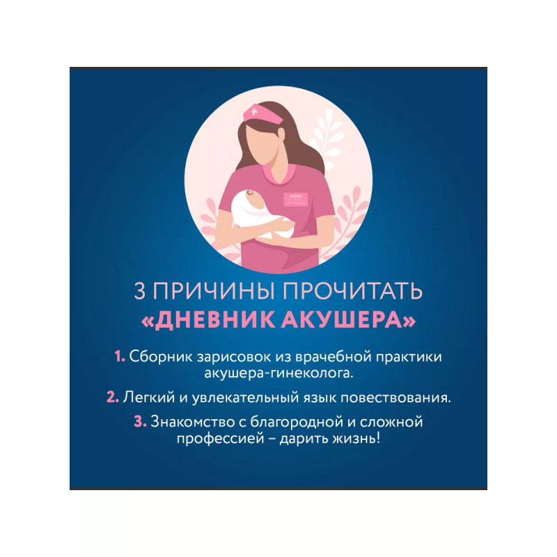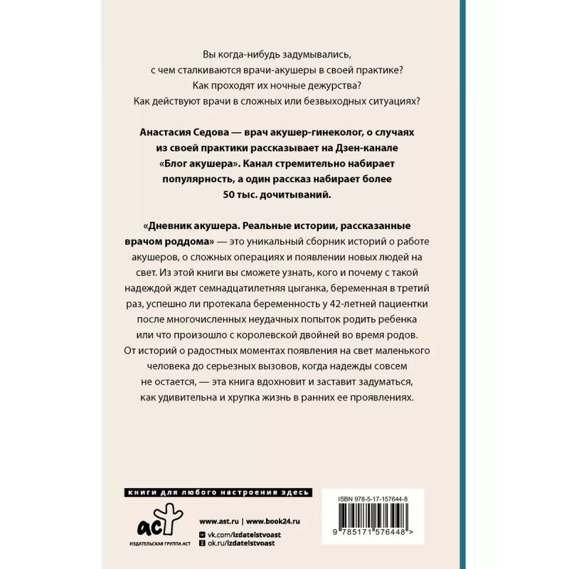 Дневник акушера. Реальные истории, рассказанные врачом роддома. Ночные дежурства, экстренные случаи, слезы счастья и первый крик младенца - будни акушера-гинеколога проходят насыщенно, каждый день он сталкивается с ситуациями, в которых промедление или небрежность могут стоить жизни матери и ребенку. В книге "Дневник акушера" врач Анастасия Седова рассказывает о своей работе в родильном отделении и делится историями из практики - забавными, курьезными, а иногда и подлинно трагическими. Они заставляют задуматься о ценности и хрупкости человеческой жизни, дарят надежду и раскрывают детали благородной и сложной профессии - дарить жизнь!