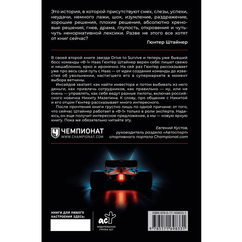 Команда Haas F1 не продлила контракт со своим многолетним боссом Гюнтером Штайнером! После успеха книги "Выживать, чтобы гонять" Штайнеру не пришлось долго думать над продолжением. Старый-добрый сквернослов, но теперь уже не скованный корпоративными рамками "Формулы-1", рассказывает о годах, проведенных в Haas — команде, которую он создал с нуля и сделал жизнеспособной. Гюнтер Штайнер погружает в детали работы с командой-аутсайдером и сложности развития болида, откровенно рассказывает о взаимодействии с FIA, об отношениях с руководителями команд, собственными гонщиками (в частности, с Романом Грожаном), русским бизнесом — и, конечно же, не упускает возможности сказать пару ласковых Джину Хаасу.