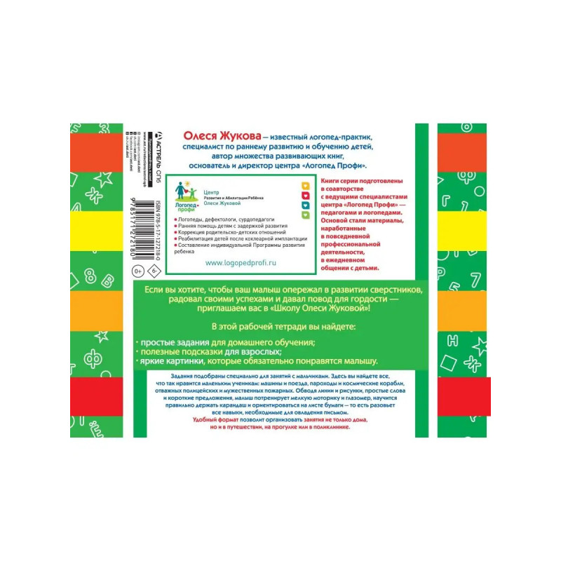 Эта книга создана специально для занятий с мальчиками. В ней вы найдете все, что так нравится маленьким ученикам: машины и поезда, пароходы и космические корабли, отважных полицейских и мужественных пожарных. Обводя линии и рисунки, простые слова и короткие предложения, малыш потренирует мелкую моторику и глазомер, научится правильно держать карандаш и ориентироваться на листе бумаги то есть разовьет все навыки, необходимые для овладения письмом. Для детей до пяти лет.