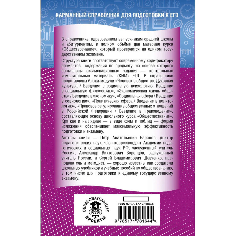 В справочнике, адресованном выпускникам средней школы и абитуриентам, в полном объеме дан материал курса "Обществознание", который проверяется на едином государственном экзамене. Структура книги соответствует современному кодификатору элементов содержания по предмету, на основе которого составлены экзаменационный заданий — контрольные измерительный материалы (КИМ) ЕГЭ. В справочнике представлены блоки-модули "Человек в обществе. Духовная культура / Введение в социальную психологию. Введение в социальную философию", "Экономическая жизнь общества / Введение в экономику", "Социальная сфера / Введение в социологию", "Политическая сфера / Введение в политологию", "Правовое регулирование общественных отношений в Российской Федерации / Введение в правоведение", составляющие основу школьного курса "Обществознание". Кратка и наглядная — в виде схем и таблиц — форма изложения обеспечивает максимальную эффективность подготовки к экзамену.