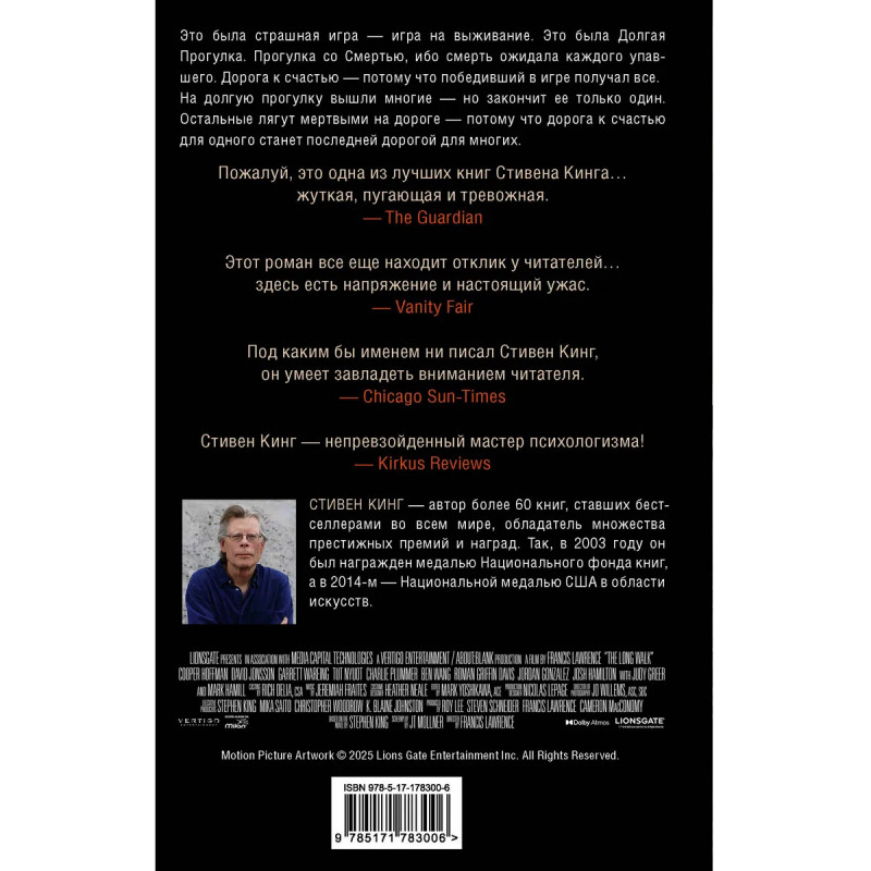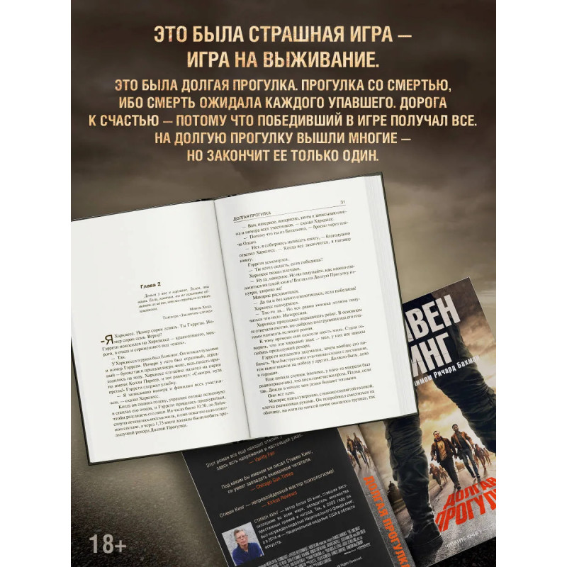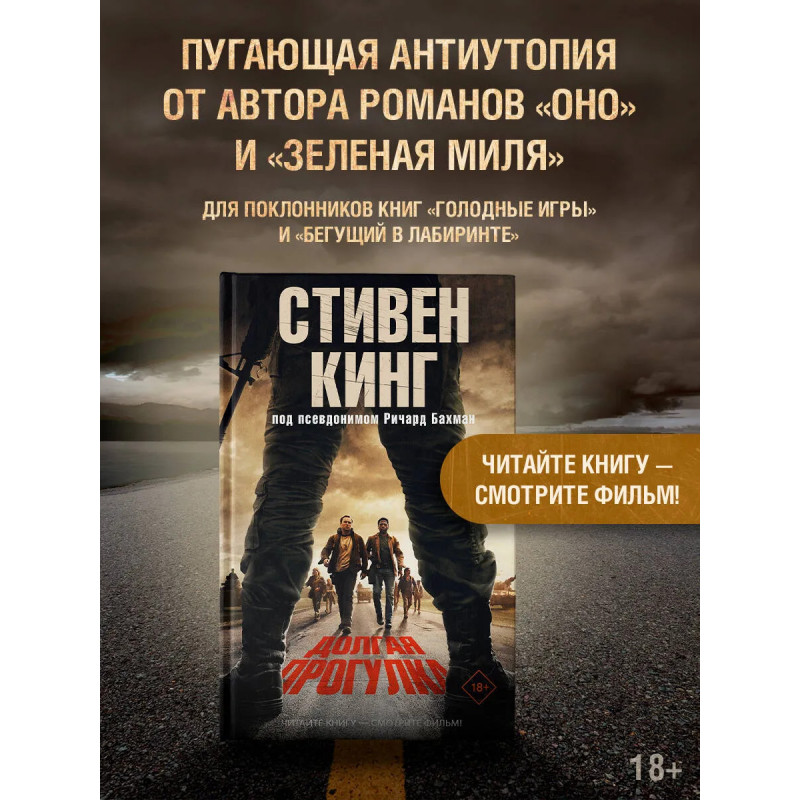 — От автора романов «Зеленая миля», «Сияние» и «Оно». — Стивен Кинг — один из самых популярных писателей современности. Он создал свыше семи десятков бестселлеров, которые переведены на 44 языка, изданы в 80 странах мира и разошлись по свету тиражом свыше 400 000 000 экземпляров. — «Долгая Прогулка» — самый первый роман Стивена Кинга, написанный еще в 1967-68 годах. Кинг более десяти лет пытался его опубликовать, но в итоге роман вышел лишь в 1979 году — под псевдонимом «Ричард Бахман». — Сам Стивен Кинг считает «Долгую Прогулку» лучшим из своих ранних произведений. — В данном издании роман публикуется в переводе Екатерины Романовой. — Читайте книгу — смотрите фильм. В сентябре 2025 года в кино выходит экранизация романа, режиссером которой выступил Фрэнсис Лоуренс («Сойка-пересмешница», «И вспыхнет пламя»), а главные роли сыграли Купер Хоффман («Лакричная пицца») и Марк Хэмилл («Звездные войны»).