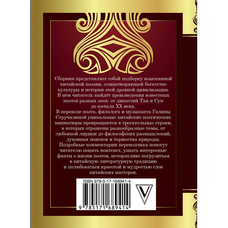 Сборник представляет собой подборку изысканной китайской поэзии, олицетворяющей богатство культуры и истории этой древней цивилизации. В нём читатель найдёт произведения известных поэтов разных эпох: от династий Тан и Сун до начала ХХ века. В переводе поэта, филолога и музыканта Галины Стручалиной уникальные китайские поэтические миниатюры превращаются в трогательные строки, в которых отражены разнообразные темы, от любовной лирики до философских размышлений, духовных поисков и торжества природы. Подробные комментарии переводчика помогут читателю понять контекст, узнать интересные факты о жизни поэтов, неторопливо погрузиться в китайскую литературную традицию и полюбоваться красотой и мудростью слов китайских мастеров.