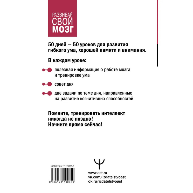 Пройдя этот 50-дневный курс, вы получите не только здоровый тренированный мозг, но и заметно повысите общий тонус всего организма! А также вы научитесь, мыслить оригинально и креативно, взвешенно принимать важные решения, быстро находить нужные ответы.