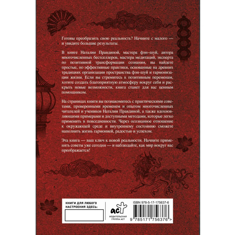 Готовы преобразить свою реальность? Начните с малого — и увидите большие результаты. В книге Наталии Правдиной, мастера фэн–шуй, автора многочисленных бестселлеров, мастера медитаций, эксперта по позитивной трансформации сознания, вы найдете простые, но эффективные практики, основанные на древних традициях организации пространства фэн-шуй и гармонизации жизни. Если вы стремитесь к позитивным переменам, хотите создать благоприятную атмосферу вокруг себя и раскрыть новые возможности, книга станет для вас ценным помощником. На страницах книги вы познакомитесь с практическими советами, проверенными временем и опытом многочисленных читателей и учеников Наталии Правдиной, а также вдохновляющими примерами и доступными методами, которые легко применить в повседневности. Через осознанное отношение к окружающей среде и внутреннему состоянию сможете наполнить жизнь гармонией, радостью и успехом. Эта книга — ваш ключ к новой реальности.