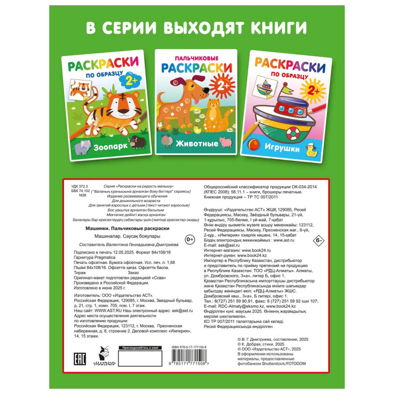 «Машинки. Пальчиковые раскраски» — всё для запуска речи и развития мелкой моторики: широкий цветной контур + пальчиковое рисование + весёлые, лёгкие в запоминании стихи. Новая книга серии «Раскраски на радость малышу» создана специально для раннего развития ребёнка. Через плотную бумагу не просвечивают даже самые яркие краски. Широкий цветной контур подскажет ребёнку, каким цветом можно раскрасить картинку, а пальчиковое рисование сделает процесс не только весёлым, но и полезным: малыш будет развивать тактильную чувствительность, мелкую моторику, воображение и образное мышление, исследовать на ощупь текстуру бумаги и красок — идеально для запуска речи малыша.