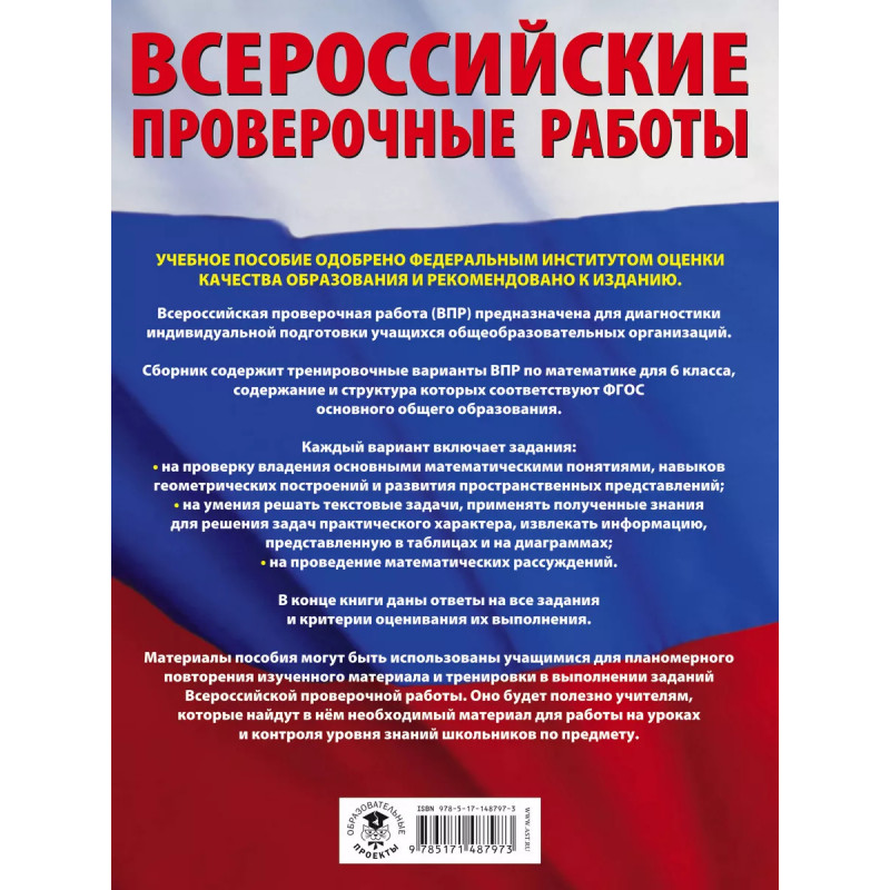 Математика. Большой сборник тренировочных вариантов проверочных работ для подготовки к ВПР. 6 класс. Данное пособие предназначено для учащихся 6-х классов общеобразовательных организаций. Оно позволяет в кратчайшие сроки проверить свои знания, потренироваться в выполнении заданий и тем самым успешно подготовиться к выполнению Всероссийской проверочной работы по математике по итогам обучения в 6-м классе. Пособие содержит 15 тренировочных вариантов проверочных работ. Содержание проверочной работы соответствует Федеральному государственному образовательному стандарту основного общего образования. В конце книги даны ответы на все задания, решения и критерии оценивания. Материалы пособия будут полезны учителям, которые найдут в нём материал для работы на уроках и контроля уровня знаний школьников по предмету. Учебное пособие одобрено Федеральным институтом оценки качества образования (ФИОКО) и рекомендовано к изданию.