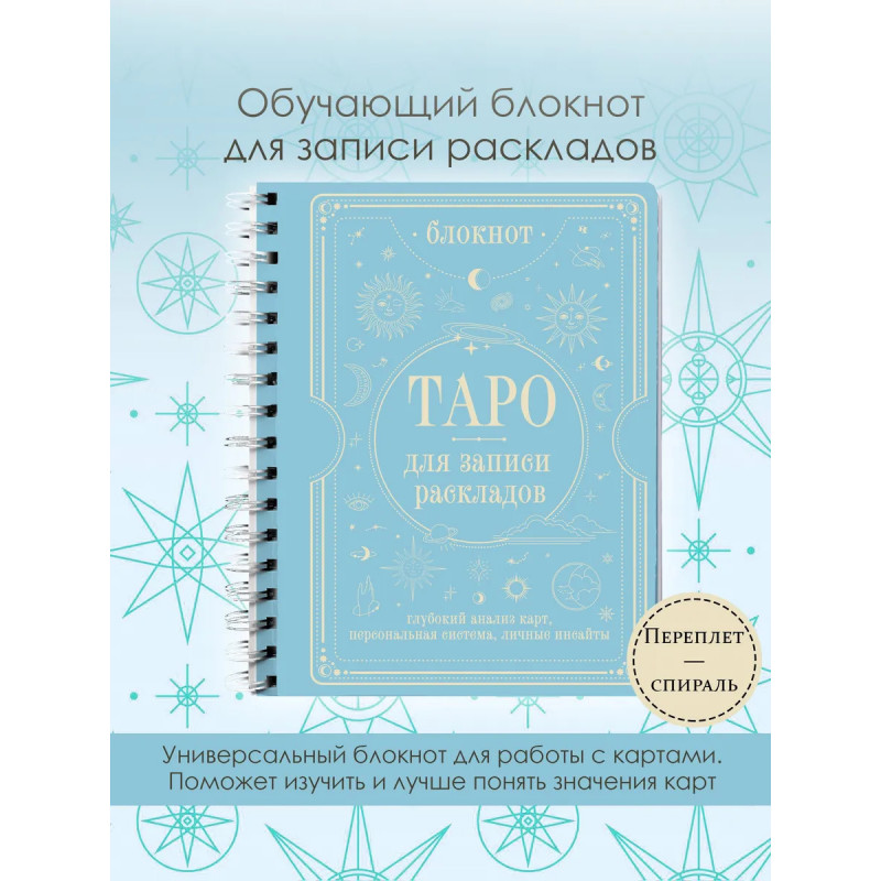 Блокнот для раскладов — это идеальный помощник для работы с картами Таро, который станет полезным дополнением к вашей первой колоде и книге. Делая записи в блокноте, вы научитесь видеть закономерности и знаки карт. Они помогут найти соответствия предсказанным событиям в жизни, не упустить нюансы, которые со временем неизбежно забываются, понять, что каждая карта означает именно для вас. Работать с блокнотом довольно просто и полезно. Сделайте расклад — запишите дату, выпавшие карты и как вы их прочитали в тот момент. Затем спустя время вы сможете вернуться к записи и понять, насколько точным было предсказание. Блокнот станет полезным приобретением для новичка вместе с первой колодой или книгой и поможет быстро набрать опыт в практике толкования. Для опытных тарологов дневник станет отличным помощником, чтобы не забывать трактовки. Блокнот ярко оформлен и удобен в работе. Внутри вы найдете: краткое описание карт, небольшие подсказки, которые помогут в трактовке, памятку по работе с перевернутыми картами, совет