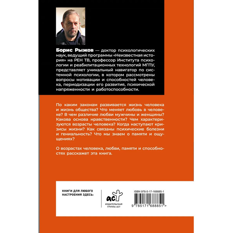 Борис Рыжов доктор психологических наук, ведущий программы "Неизвестная история" РЕН ТВ, профессор Института психологии и реабилитационных технологий МГПУ, представляет уникальный навигатор по системной психологии, в котором рассмотрены вопросы мотивации и способностей человека, периодизации его развития, психической напряженности и работоспособности. По каким законам развивается жизнь человека и жизнь общества? Что меняет любовь в человеке? В чем различие любви мужчины и женщины? Какова основа нравственности? Чем характеризуются возрасты человека? Когда наступают кризисы жизни? Как связаны психические болезни и гениальность? Что мы знаем о памяти и ощущениях? О возрастах человека, любви, памяти и способностях расскажет эта книга.