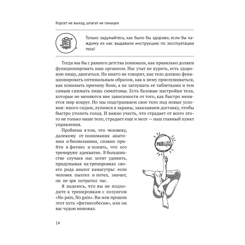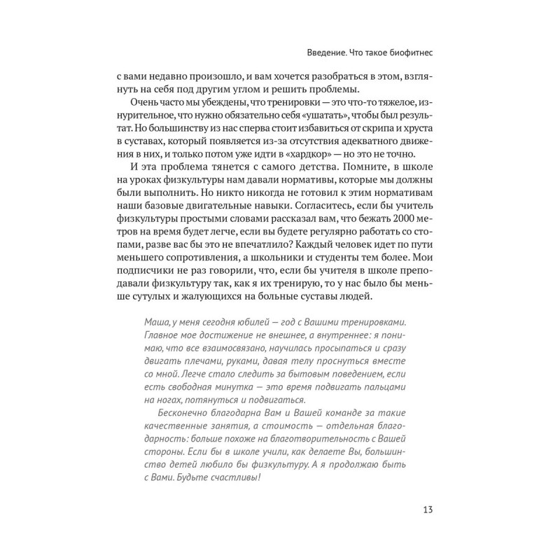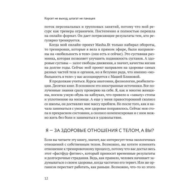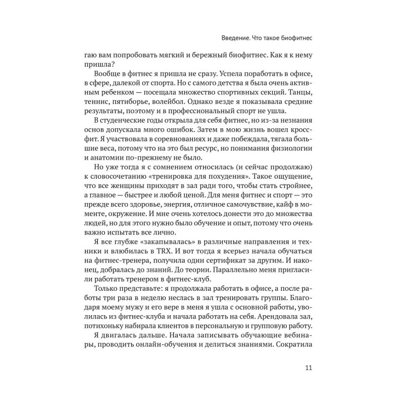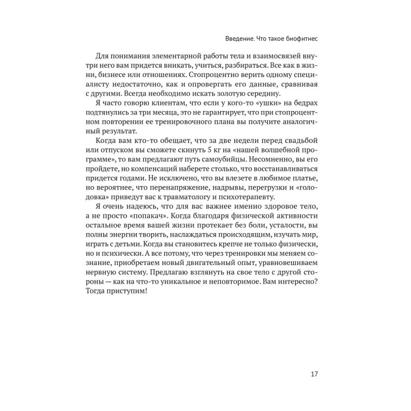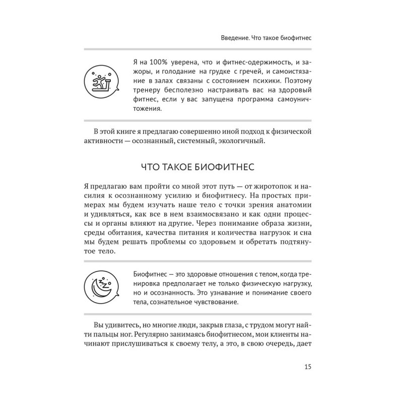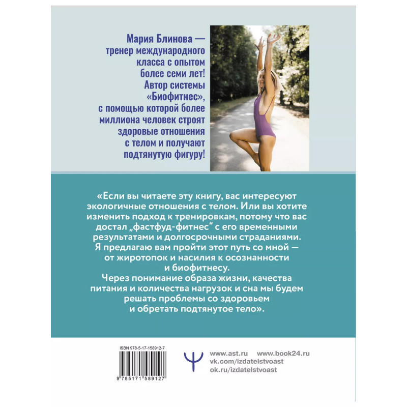 Биофитнес это комплекс тренировок, основанный на изучении базовых потребностей организма и индивидуальных особенностей тела. Специалист по движению и практикующий фитнес-тренер Мария Блинова расскажет о том, как через понимание образа жизни, качества питания, количества нагрузок и режима сна решить проблемы со здоровьем и обрести подтянутое тело избавиться от боли в мышцах и суставах, убрать лишний вес и навсегда забыть о диетах. Эта книга для тех, кто устал от тренировок, которые приносят временные результаты и долгосрочные страдания. Выстраивайте экологичные отношения со своим телом, с помощью авторских рекомендаций и пошаговых упражнений для различных зон тела! Просто сканируйте QR-код и занимайтесь в любом удобном для вас ритме, попутно изучая полезную теорию.