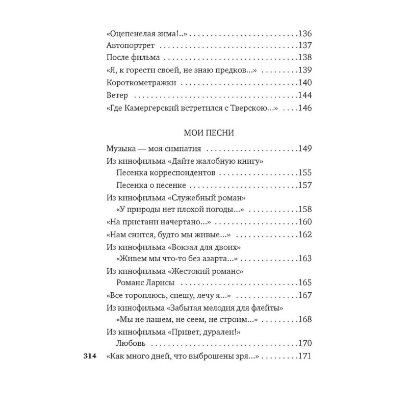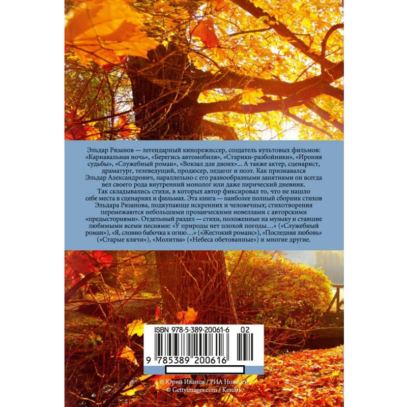 Эльдар Рязанов легендарный кинорежиссер, создатель культовых фильмов: Карнавальная ночь, Берегись автомобиля, Старики-разбойники, Ирония судьбы, Служебный роман, Вокзал для двоих... А также актер, сценарист, драматург, телеведущий, продюсер, педагог и поэт! Как признавался Эльдар Александрович, параллельно с его разнообразными занятиями он всегда вел своего рода внутренний монолог или даже лирический дневник. Так складывались стихи, в которых автор фиксировал то, что не нашло себе место в сценариях и фильмах. Эта книга наиболее полный сборник стихов Эльдара Рязанова, подкупающе искренних и человечных; стихотворения перемежаются небольшими прозаическими новеллами с авторскими предысториями. Отдельный раздел стихи, положенные на музыку и ставшие любимыми всеми песнями: У природы нет плохой погоды (Служебный роман), Я, словно бабочка к огню (Жестокий романс), Последняя любовь (Старые клячи), Молитва (Небеса обетованные) и многие другие.