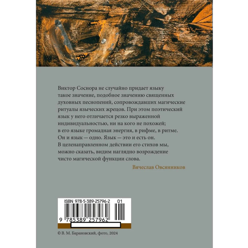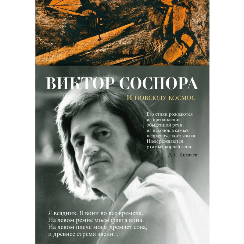 Виктор Александрович Соснора (19362019) поэт, драматург, прозаик, переводчик. Прямой продолжатель традиций русского литературного авангарда и безусловный классик, творческое наследие которого еще предстоит осмыслить. Многие годы руководил литературным объединением в Ленинграде. Писать стихи начал в шестнадцать лет, но ранних стихотворений сохранилось очень мало автор, по его собственным словам, испытывал тягу к самосожжению и многое попросту уничтожил. Его стихи по мотивам Слова о полку Игореве принесли ему заслуженную славу: За четыре месяца я стал знаменит, распечатан в самых верхнепартийных изданиях и вошел впервую четверку поэтов страны. Но его творчество не подчинялось ни стимулам, ни ограничениям, это был художник, отличающийся какой-то первозданной, космической внутренней свободой. Я никогда не писал ни для читателя, ни для... ни для кого! Хуже того скажу вам: я и для себя не писал никогда. Это просто находит какое-то состояние, понимаете... и... пишется. А потом не пишется.