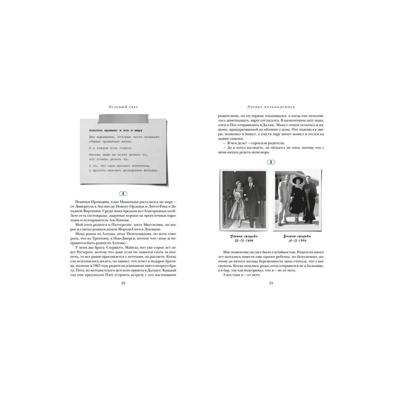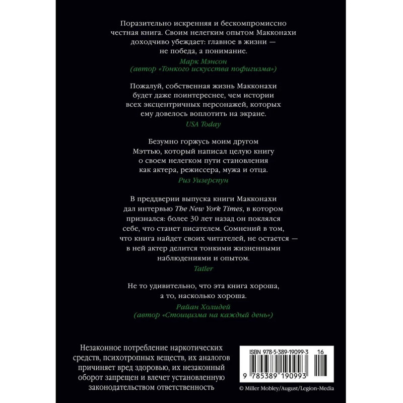 Впервые на русском — одно из главных книжных событий 2020 года, «Зеленый свет» знаменитого Мэттью Макконахи (лауреат «Оскара» за главную мужскую роль в фильме «Далласский клуб покупателей», Раст Коул в сериале «Настоящий детектив», Микки Пирсон в «Джентльменах» Гая Риччи) — отчасти иллюстрированная автобиография, отчасти учебник жизни. Став на рубеже веков звездой романтических комедий, Макконахи решил переломить судьбу и реализоваться как серьезный драматический актер. Он рассказывает о том, чего ему стоило это решение — и другие судьбоносные решения в его жизни: уехать после школы на год в Австралию, сменить юридический факультет на институт кинематографии, три года прожить на колесах, путешествуя от одной съемочной площадки к другой на автотрейлере в компании дворняги по кличке Мисс Хад, и главное — заслужить уважение отца …