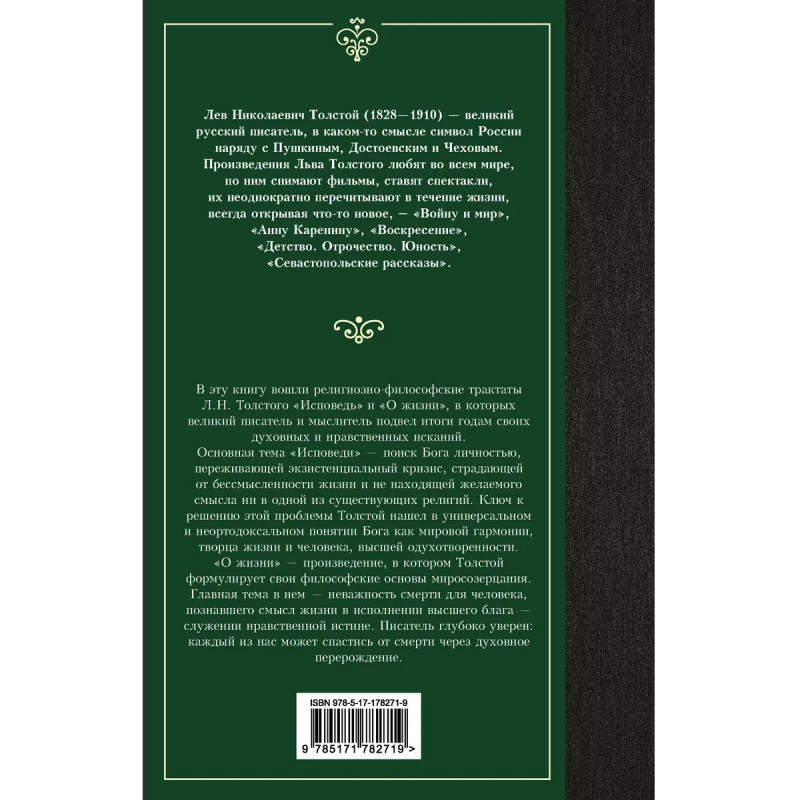 — Лев Николаевич Толстой — один из главных писателей всей русской литературы, автор романов «Война и мир» и «Анна Каренина». — В данное издание вошли религиозно-философские трактаты «Исповедь» и «О жизни», подводящие итог всем духовно-нравственным исканиям автора. — Издание в узнаваемом оформлении серии «Лучшая мировая классика».
