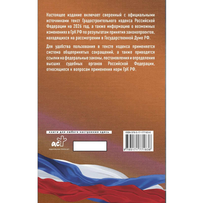 Данное издание Градостроительного кодекса РФ сверено с официальным источником и приводится по состоянию на 2026 год. Кодекс учитывает все изменения, опубликованные в официальных источниках на момент подписания издания в печать. В издании представлена информация о возможных изменениях в ГрК РФ по результатам принятия законопроектов, находящихся на рассмотрении в Государственной Думе РФ. Для удобства пользования в тексте кодекса применяется система общепринятых сокращений, а также приводятся ссылки на федеральные законы, постановления Правительства Российской Федерации, постановления и определения высших судебных органов Российской Федерации, относящиеся к вопросам применения норм ГрК РФ.
