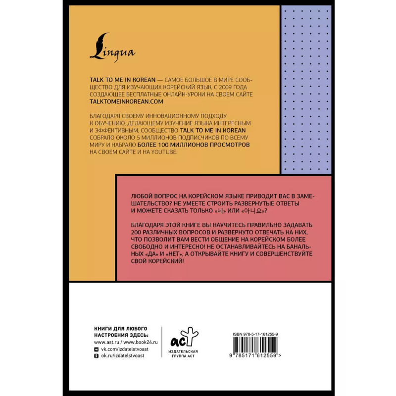 Перед вами инновационное и увлекательное учебное пособие от Talk To Me In Korean самого большого сообщества по изучению корейского языка в мире. Talk To Me In Korean это команда профессиональных преподавателей корейского языка, выпустивших более 100 миллионов онлайн-уроков и около сотни учебных пособий, а также собравших более 5 миллионов подписчиков по всему миру! Любой вопрос на корейском языке приводит вас в замешательство? Не умеете строить развернутые ответы и можете сказать только "" или ""? С этой книгой вы научитесь правильно задавать 200 различных вопросов и развернуто отвечать на них, что позволит вам общаться на корейском свободно и интересно! Не останавливайтесь на банальных "да" и "нет", а открывайте книгу и совершенствуйте свой корейский! Книга будет полезна всем, кто изучает корейский язык и желает повысить навыки общения на корейском языке, сделав свою речь разнообразнее и интереснее.