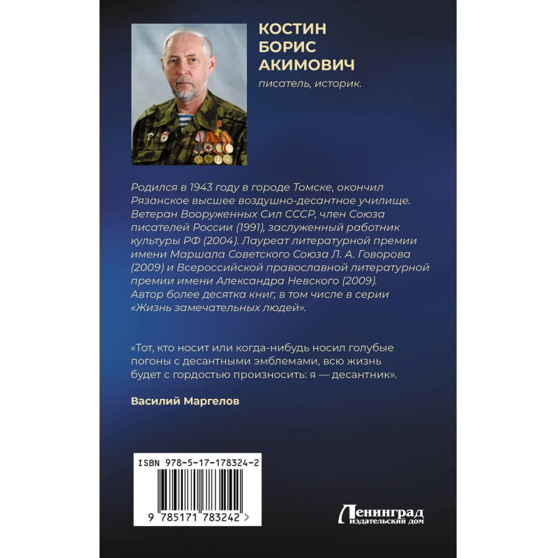 С именем Героя Советского Союза генерала армии Василия Филипповича Маргелова (1906–1990) неразрыв- но связаны многие яркие страницы истории Воздушно- десантных войск СССР. У ветеранов Великой Отечествен- ной войны В. Ф. Маргелов остался в памяти как участник знаменитого Парада Победы на Красной площади в Москве в июне 1945 года. Ему по праву принадлежит первенство в разработке вопросов оперативно-стратегического при- менения Воздушно-десантных войск, оснащения их совре- менной мобильной техникой и средствами десантирования. Пройдя путь от командира соединения до командующего ВДВ, В. Ф. Маргелов превратил Воздушно-десантные войска в элиту Вооруженных Сил. И вовсе не случайно, что и поныне аббревиатура "ВДВ" расшифровывается и в шут- ку, и всерьез как "Войска дяди Васи", а девизом десантни- ков на все времена стали крылатые слова В. Ф. Маргелова: "Никто, кроме нас!"
