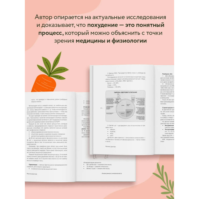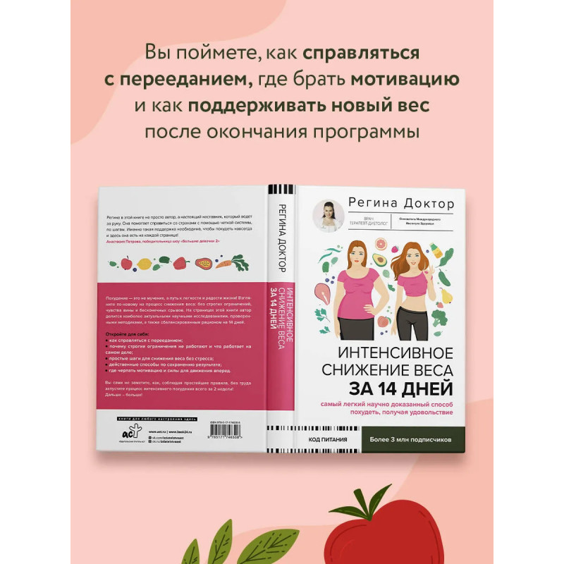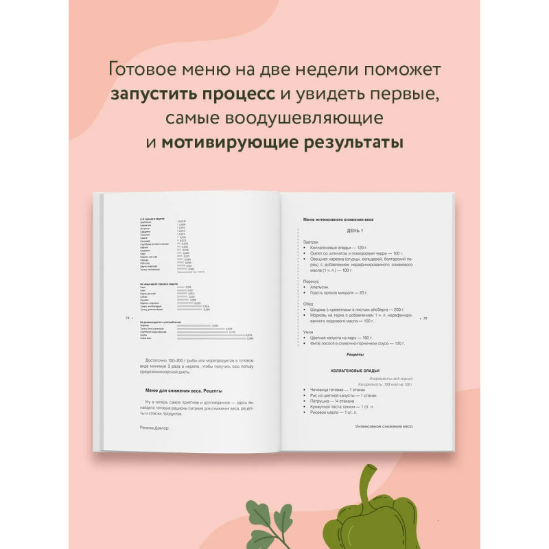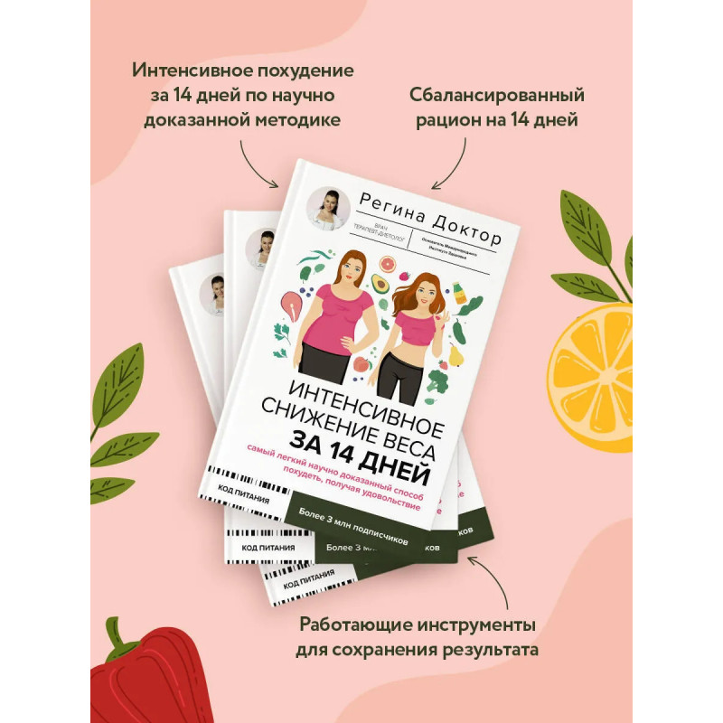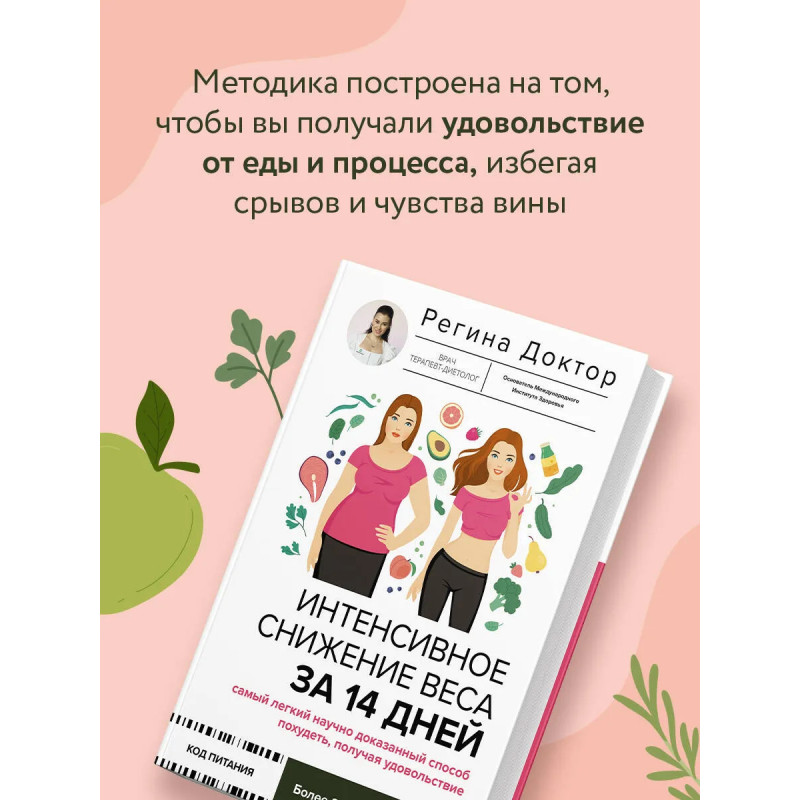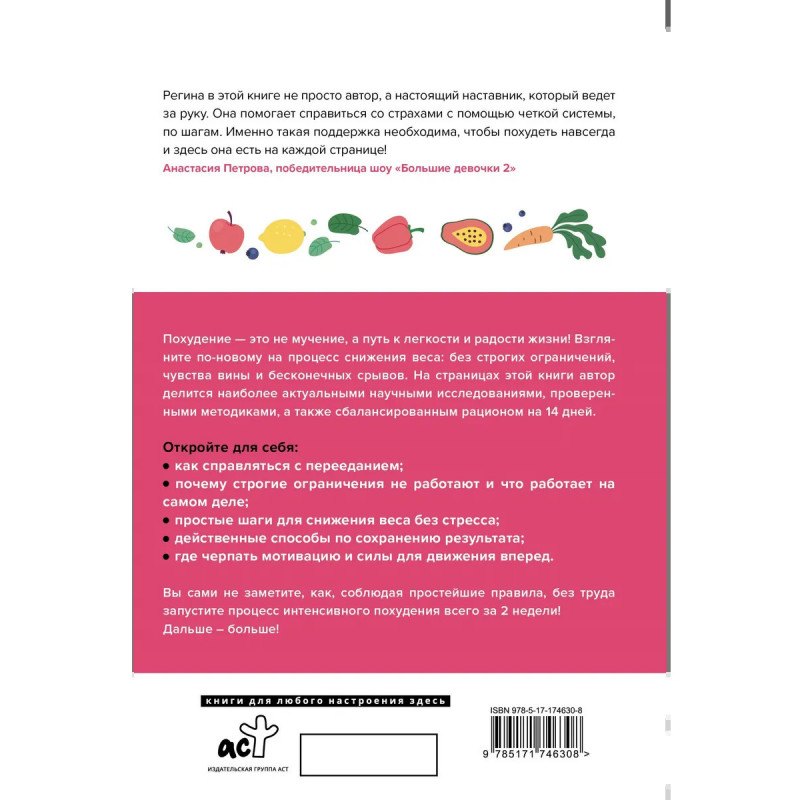 Регина Доктор — врач-диетолог, основатель Международного Института Здоровья, телеведущая реалити "Большие девочки" и автор популярного блога о здоровом питании. Похудение — это не мучение, а путь к лёгкости и радости жизни! Взгляните по-новому на процесс снижения веса: без строгих ограничений, чувства вины и бесконечных срывов. На страницах этой книги автор делится наиболее актуальными научными исследованиями, проверенными методиками, а также сбалансированным рационом на 14 дней. Откройте для себя: * как справляться с перееданием; * почему строгие ограничения не работают и что работает на самом деле; * простые шаги для снижения веса без стресса; * действенные способы по сохранению результата; * где черпать мотивацию и силы для движения вперёд. Вы сами не заметите, как соблюдая простейшие правила, вы без труда запустите процесс интенсивного похудения всего за 2 недели! Дальше – больше!