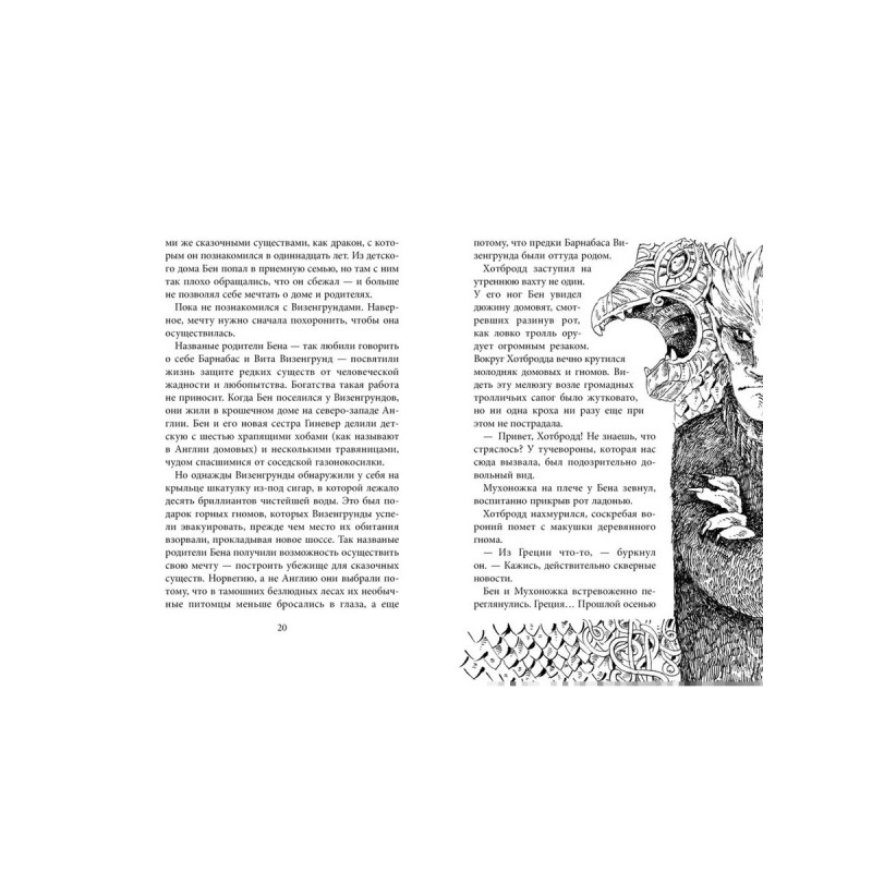 Прошло два года после победы над ужасающим Крапивником. Последние оставшиеся на земле драконы, как и многие другие мифические существа, нашли приют в Мимамейдре – скрытой от людских глаз норвежской долине, где Бен и его новая семья устроили заповедник для мифических созданий. Но никакое пристанище не защитит от всех невзгод. Наших героев ожидает новое опасное приключение! На этот раз Бен, Барнабас и Мухоножка должны раздобыть солнечное перо грифона, и от успеха их миссии зависит будущее целого вида! Если же поиски ни к чему не приведут, потомство последней на Земле пары пегасов погибнет... Но мало того, что грифонов весьма непросто разыскать – они не славятся услужливостью и совершенно не расположены раздаривать свои перья. А их силу и ловкость дополняет чрезвычайно вспыльчивый нрав. Правда, грифоны также известны своей меркантильностью, вернее – алчностью, так что небольшой шанс у наших героев все-таки есть.