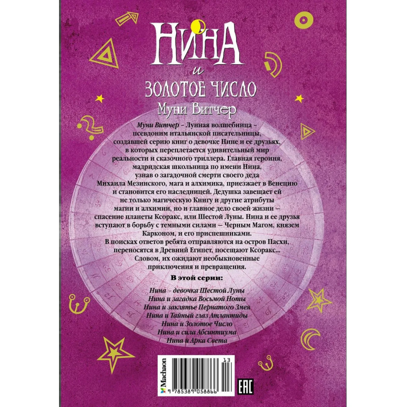 Муни Витчер – Лунная волшебница – псевдоним итальянской писательницы, создавшей серию книг о девочке Нине и ее друзьях, в которых переплетается удивительный мир реальности и сказочного триллера. Главная героиня, мадридская школьница по имени Нина, узнав о загадочной смерти своего деда Михаила Мезинского, мага и алхимика, приезжает в Венецию и становится его наследницей. Дедушка завещает ей не только магическую Книгу и другие атрибуты магии и алхимии, но и главное дело своей жизни – спасение планеты Ксоракс, или Шестой Луны. Нина и ее друзья вступают в борьбу с темными силами – Черным Магом, князем Карконом, и его приспешниками. В поисках ответов ребята отправляются на остров Пасхи, переносятся в Древний Египет, посещают Ксоракс… Словом, их ожидают необыкновенные приключения и превращения.