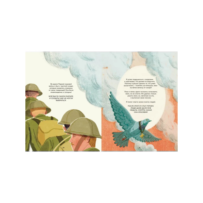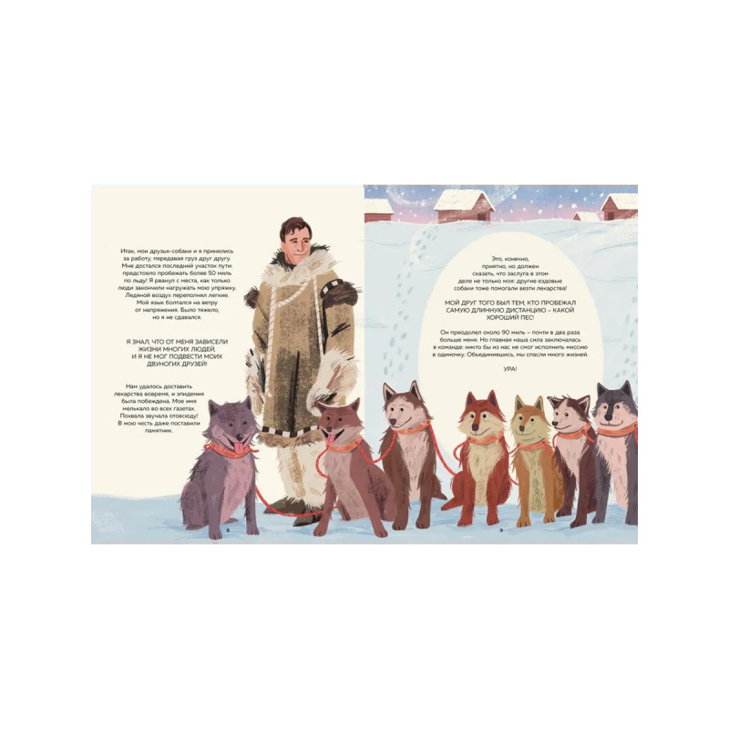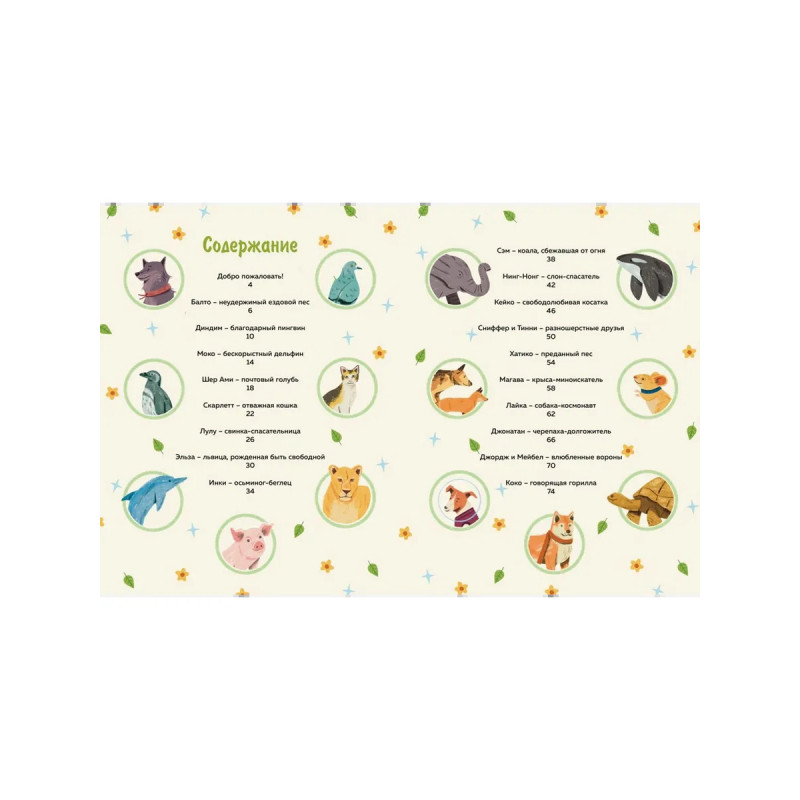 Так, вы узнаете про бесстрашного пса Балто, доставившего лекарства жителям маленького городка на Аляске в период эпидемии, про полет в космос отважной Лайки, о бескорыстном дельфине Моко, который помог двум китам найти дорогу домой, а также о почтовом голубе, спасшем жизни многих людей.